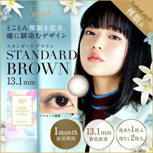 レンズ情報 【Naked Style 裸眼系】 とことん裸眼を追求、瞳に馴染むデザイン ■スタンダードブラウン 瞳の色が標準的な明るさの方におすすめ 商品スペック スタンダードブラウン12.6mm ●販売名 セレクトフェアリー マンスリー ●タイプ カラーコンタクトレンズ / 1ヶ月交換タイプ ●枚数 1箱1枚入 ●承認番号 22600BZX00094A04 ●ベースカーブ 8.6mm ●パワー 0.00、-0.50〜-6.00(0.25step)、-6.50〜-9.00(0.50step) ●直径 14.2mm ●着色直径 12.6mm ●中心厚(-3.00Dの場合) 0.085mm ●含水率 38.0% ●メーカー名 株式会社シンシア ●製造国 台湾製 ●高度管理医療機器等販売業許可番号 第4301021000003号 ●区分 高度管理医療機器 スタンダードブラウン13.1mm ●販売名 セレクトフェアリー マンスリー ●タイプ カラーコンタクトレンズ / 1ヶ月交換タイプ ●枚数 1箱1枚入 ●承認番号 22600BZX00094A04 ●ベースカーブ 8.6mm ●パワー 0.00、-0.50〜-6.00(0.25step)、-6.50〜-9.00(0.50step) ●直径 14.2mm ●着色直径 13.1mm ●中心厚(-3.00Dの場合) 0.085mm ●含水率 38.0% ●メーカー名 株式会社シンシア ●製造国 台湾製 ●高度管理医療機器等販売業許可番号 第4301021000003号 ●区分 高度管理医療機器 眼科医院等にて検査を受けてからお求めください