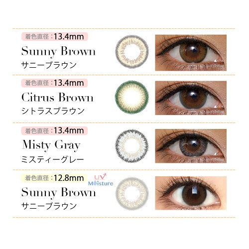 暗めの瞳におすすめ 【Natural Style ナチュラル系】 自然に華やかになれるデザイン ■サニーブラウン 美しいグラデーションと、ナチュラルなブラウンで使いやすさ◎ ■シトラスブラウン 透明感のあるブラウンと上品なグリーンが驚くほど目に馴染む、北欧ニュアンスの瞳 ■ミスティーグレー こだわりのブルーグレーで、ほどよくキラキラ、しっかりナチュラル ■サニーブラウン12.8mm UV/モイスチャー機能を追加。